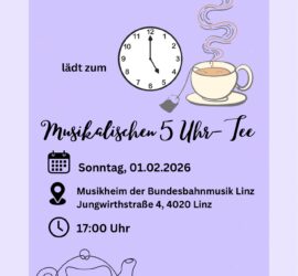 Am Sonntag, 01. Februar 2026 um 17:00h gibt es wieder den begehrten 5h Tee im Musikheim Linz, Jungwirthstraße 4.Mundartleser Rupert Hainbucher, die Saubergbuam, das Klarinettenquintett und die Feststürmer sorgen für diesen besonderen Tagesausklang.  Eintritt :FREIWILIGE SPENDEN Wir freuen uns auf deinen Besuch.
